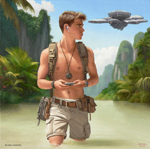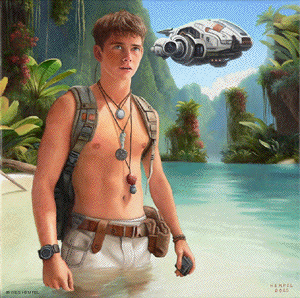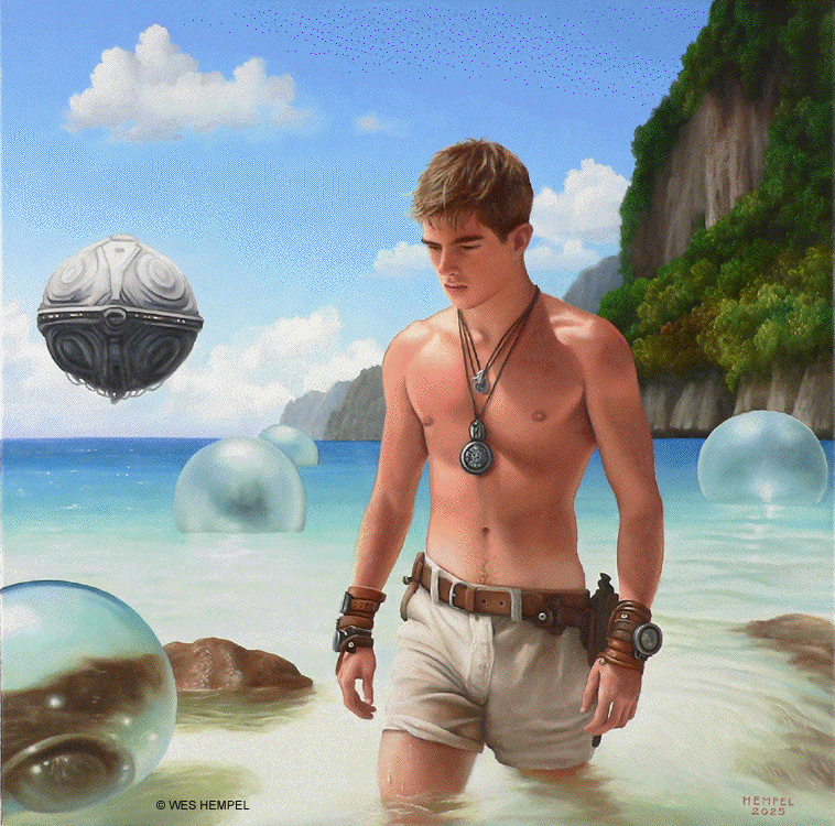 These paintings of imaginary film stills are based on a screenplay for a Science Fiction film, titled Regression, that an uncle of mine developed in the 1950s. The film was never made, nor, to my knowledge, has any of the script survived, but from memory I've tried to recreate what actual scenes may have looked like had the film been made. From what I remember of my uncle's stories, the script was about a crew of astronauts who travel to a tropical exoplanet that has an earth-like atmosphere. They begin exploring the surface in pairs but almost immediately get separated and lose contact with each other and with the ship. Isolated, they begin to reverse in age. It takes some time for them to notice, but they're growing younger at alarming rates. They wade in the shallows of coves, discovering that something in the water slows the regression process. Their ship sometimes reappears in the sky, but oddly in differing forms, as if something's trying to replicate it but can't get it right. Later it's revealed that the planet itself is a sentient life form that is purposefully regressing them. It senses dishonesty and aggression in them (elements fleshed out in earlier subplots) and can only communicate with minds that are free of guile. By returning them to their more innocent boyhoods, it hopes to establish contact. Wes Hempel ______________